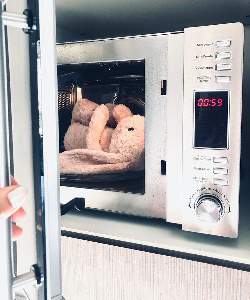 First remove all tags. Ensure that your microwave is clean and the turntable can rotate freely. Place your Snugmees in the microwave for 60 to 90 seconds. Continue heating at 60 to 90 second intervals until required warmth. Warmed Snugmees relieve and soothe. It can take your Snugmees up to four hours to cool down back to room temperature. With the proper care, Snugmees are designed to be reheated and used for a lifetime!